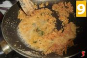 Ora dovete preparare la miscela di pangrattato per formare la gratinatura. In una padella mettete un filo di olio e il prezzemolo tritato (7) , aggiungete uno spicchio di aglio tritato e il pan grattugiato (8) . Mescolate a fuoco basso aggiungendo uno o due cucchiai di vino bianco e il sale. (9)