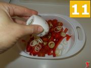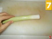 Ponete il porro fresco sopra un tagliere (7), e con un coltello dalla lama lunga tagliuzzatelo a rondelle sottili (8). Aprite le rondelle con le mani ed aggiungete l'ortaggio nella stessa pirofila con gli altri ingredienti (9).