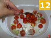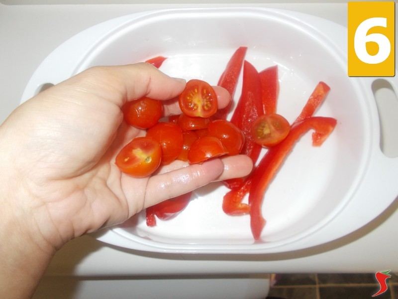 Lavate accuratamente i pomodori sotto abbondante acqua corrente (4) e dopo tagliateli in due parti con un coltello dalla lama seghettata (5). Appena conclusa questa operazione, aggiungete i pomodori nella pirofila insieme al peperone (6).