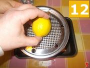Con un coltello dalla lama lunga e liscia, fate a pezzetti il branzino delle spessore di circa cinque centimetri (10), ed aggiungetelo nella teglia con l'olio (11). Ora grattugiate la scorza di limone direttamente sopra il pesce (12).