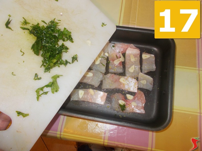 Dopo averlo lavato accuratamente sotto abbondante acqua corrente, ponete il prezzemolo sopra un tagliere pulito, e con un coltello dalla lama ben affilata, sminuzzatelo finemente (16) ed unitelo al pesce dentro la teglia (17). Ora sempre sopra un tagliere, dividete in due parti il limone che avete utilizzato per grattare la buccia (18).