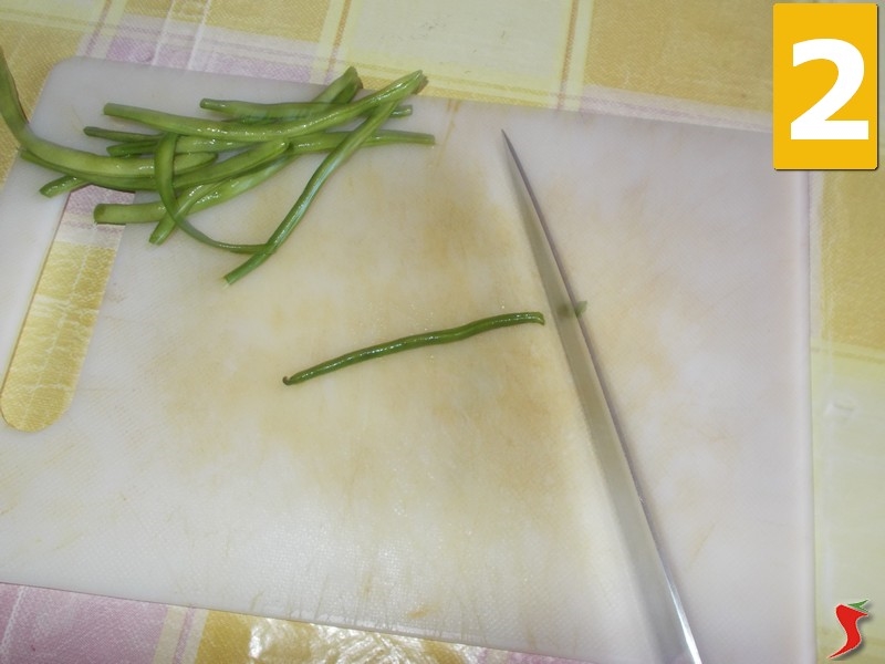 Lavate accuratamente i fagiolini sotto abbondante acqua corrente fredda utilizzando uno scolapasta (1), dopo poneteli sopra un tagliere e con un coltello eliminate le punte (2). Terminato questo passaggio, con le forbici eliminate le squame del pesce (3).