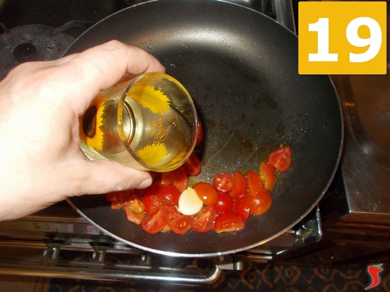 Aggiungete due cucchiaio abbondanti di olio di oliva extravergine in una padella di medie dimensioni (16), mettete sul fuoco ed aggiungetevi uno spicchio di aglio intero (17). Lasciate soffriggere a fiamma moderata per qualche minuto e dopo incorporate i pomodori pachino lavorati nel passaggio precedente (18).
