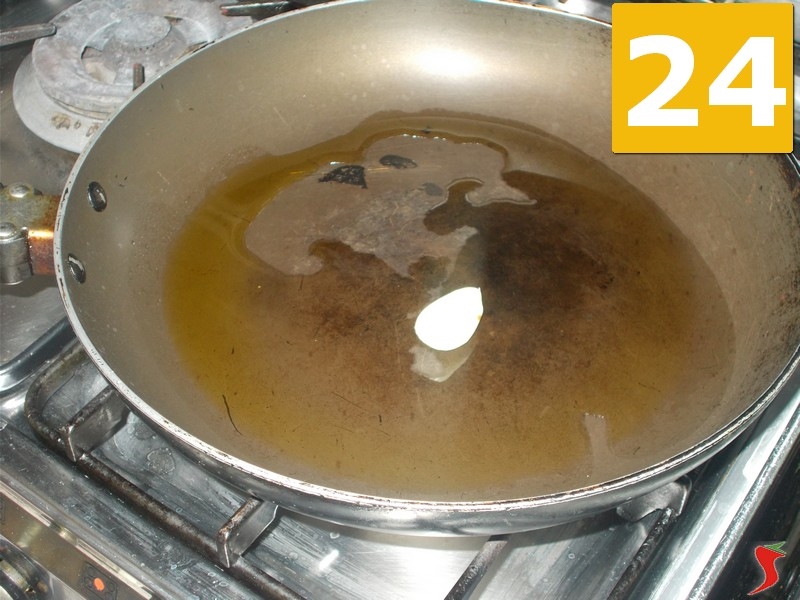 Ora sbucciate l'aglio (22) e versate cinque cucchiai di olio extravergine di oliva (23) in una padella molto ampia ed antiaderente. Fate scaldare l'olio a fuoco vivace e quindi metteteci l'aglio (24) a dorare per un paio di minuti.