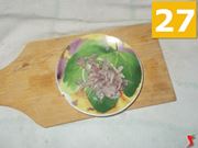 Quindi sbucciate anche lo scalogno (25) e tritatelo finemente (26). Mettete anche questo su un piattino (27) a parte e proseguite.