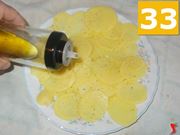 Ora sbucciate le patate (28), e poi tagliatele a fette (29) molto sottili. Lo spessore deve essere di uno o due millimetri al massimo, perché la cottura in forno è molto veloce e quindi rischiereste di non cuocere i tuberi. Quindi mettete tutte le fette su un piatto (30), ben separate.
