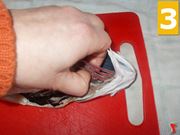 Iniziate la ricetta con la classica pulizia del pesce, che dovrete eviscerare. Aprite la pancia con le forbici (1), partendo dall'orifizio anale per tagliare fino a sotto le branchie. Quindi estraete tutte le interiora (2) con le mani, e poi tirate via le branchie (3), aiutandovi con le forbici per tagliare gli attacchi. Lavate bene e proseguite.