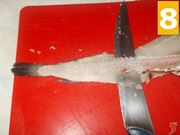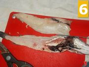 Quindi tagliate, sempre con le forbici, tutte le pinne (4), e poi, con il coltello da carne, iniziate a tagliare la pancia (5) dall'orifizio anale fino alla coda, ponendo il coltello appena sopra la spina dorsale, per ricavare il primo filetto. Staccate il primo filetto dalla colonna vertebrale, e poi separatelo dal resto del pesce all'altezza della pinna dorsale (6), tagliando la pelle.