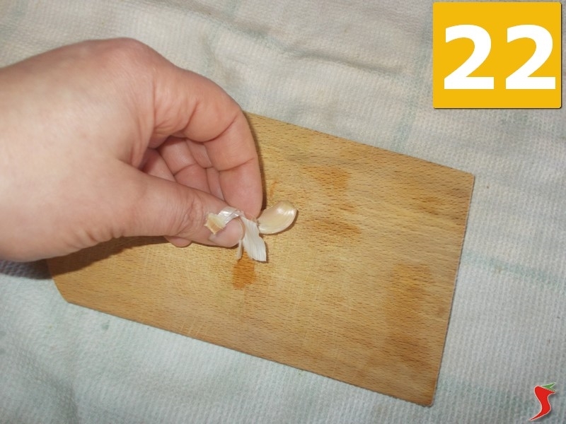Ora sbucciate lo spicchio d'aglio (22) e tagliatelo in pezzi piccoli (23) da mettere su un piattino (24) a parte.