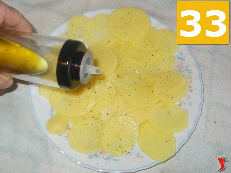 Quindi salatele (31), spolveratele con del pepe nero (32) macinato fresco e irroratele con un filo di olio (33).