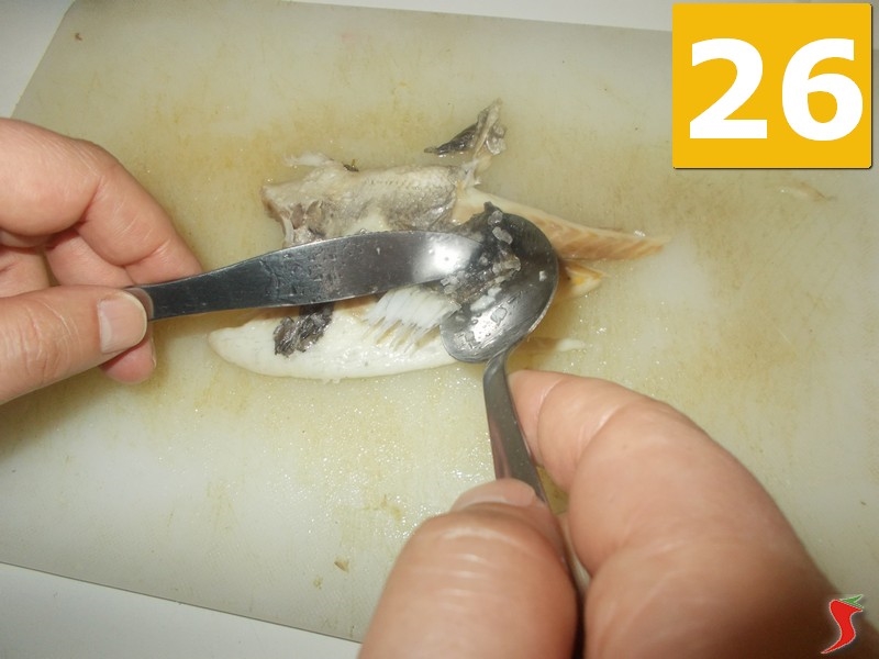 Poi prendete il pesce con la ramina e ponetelo sopra un tagliere (22). Dopo con un coltello senza punta ed un cucchiaio, iniziate ad eliminare la pelle (23), staccandola con il coltello e quindi sollevandola con il cucchiaio. La pelle, disidratata dal sale, sarà molto semplice da staccare dalla carne. Quindi, sempre con il coltello e il cucchiaio, staccate il filetto dalla spina dorsale, e sollevatelo delicatamente per ottenere il primo filetto (24).
