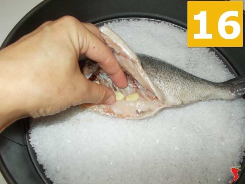Adesso prendete le fettine di aglio che avevate messo a parte, ed inseritele nella pancia (16) del pesce, e poi ripetete la stessa operazione con il prezzemolo (17), mettendolo sempre nella pancia. Infine fate la stessa cosa con le fettine di limone (18), e proseguite con la ricetta.
