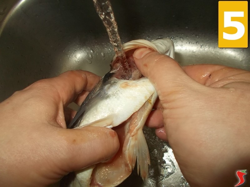 Ora lavate i pesci con cura sotto l'acqua corrente, in particolare l'interno della pancia (4) e quindi l'interno delle branchie (5) per eliminare tutti i residui di sangue e interiora. Quindi lasciate scolare i pesci dall'acqua e rimetteteli sul tagliere, e tagliate la coda (6) con il coltello.