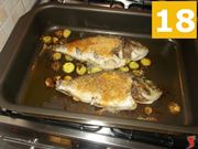 Ora siete pronti per infornare (16) la teglia in forno preriscaldato a 180°C per circa 20 minuti. Quando sono trascorsi dieci minuti sfornate la teglia per il tempo necessario per girare il pesce e spolverarlo con il pan grattato (17). Quindi infornate di nuovo e portate a fine cottura per sfornare ancora (18) e servire subito ben caldo il pesce con le zucchine disposte sul piatto.