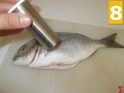 Con una forbice da cucina, tagliate la pancia dell'orata partendo dall'orifizio (1), poi con le mai estraete le interiora (2) ed infine togliete anche le branchie (3).