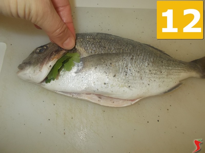 Lavate il ciuffo di prezzemolo accuratamente sotto l'acqua corrente (10) e tamponatelo con un panno da cucina di cotone, poi inseritelo in pancia all'orata (11) ed anche nelle branchie (12). Lasciate da parte su un piatto le orate e proseguite con gli altri ingredienti.