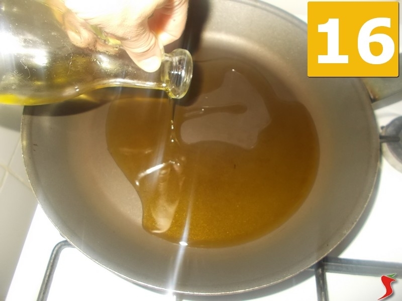Mettete a scaldare cinque cucchiai di olio extra vergine di oliva (16) e quando sarà ben caldo unite all'olio i pomodorini pachino (17) e poi l'orata precedentemente condita (18).