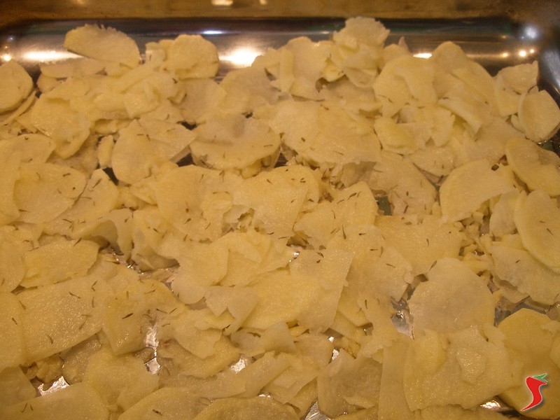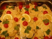 Coprire poi con le restanti patate i pesci, aggiungere un pizzico di sale e delle foglioline di prezzemolo fresco, terminare la ricetta con la decorazione di pomodorini a ciliegia tagliati a metà.Aggiungere sopra a tutto un filo d'olio extra vergine di oliva e infornare a 180° per trenta minuti.