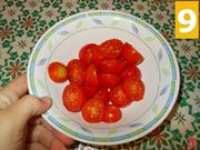 Quindi lavate bene i pomodorini pachino (7) e asciugateli, per metterli sul tagliere. Con il coltello a lama seghettata, che non viene rovinato dall'acidità del pomodoro, tagliateli a metà (8) e metteteli in una ciotolina a parte.