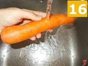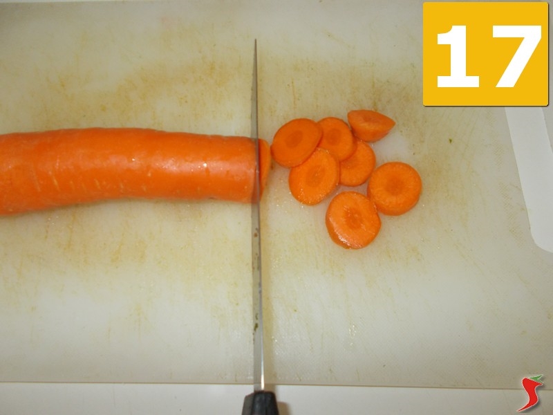 Infine prendete la carota, lavatela bene (16) sotto l'acqua corrente e quindi tagliatela a rondelle (17) sul tagliere, per mettere tutto a parte (18) su un piattino.