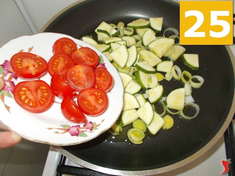Ora prendete una padella ampia ed antiaderente, versateci dentro cinque cucchiai di olio extravergine di oliva (22) e fateli scaldare a fuoco medio. Quindi metteteci il porro (23) a soffriggere e anche le zucchine (24).