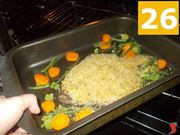 In ultimo mettete gli ortaggi lessati intorno al pesce (25) nella teglia e infornate (26) in forno preriscaldato a 180°C per circa mezzora. Una volta pronto il pesce, sfornate (27) e impiattate subito ben caldo, per servirlo in tavola.