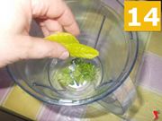 Quindi mettete la menta nel frullatore (13), lavate anche l'alloro e mettetelo insieme alla menta (14) e infine sbriciolate le fette di pane secco (15) nel frullatore.