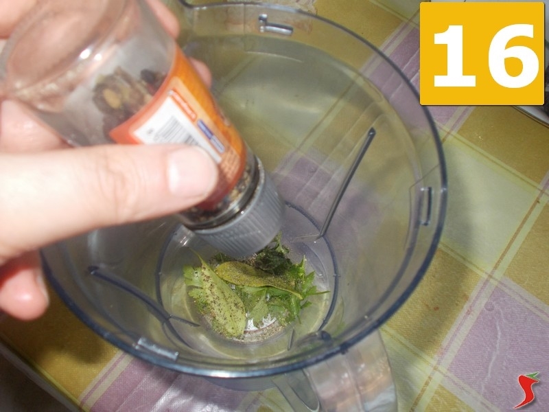Infine non vi resta che spolverare con del pepe nero (16) macinato fresco gli ingredienti nel frullatore, sui quali verserete anche cinque o sei cucchiai di olio extravergine di oliva (17), prima di frullare bene (18) il tutto.