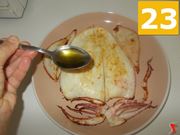 Quando le seppie saranno ben cotte e leggermente dorate, toglietele dalla piastra e mettetele su un piatto (22) caldo, stendendole bene. Quindi prendete l'olio rimasto, e con il cucchiaio distribuitelo bene sopra alle seppie (23). Prendete il limone e tagliatelo a spicchi, per servirlo in tavola a chi desidera aggiungerlo, insieme ad una seppia per ogni piatto (24), ancora molto calda. Accompagnate il piatto con un buon vino bianco dal sapore citrino, come il Vermentino di Liguria.