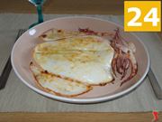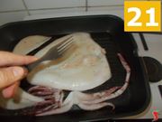 Ora prendete una piastra, e immergete di nuovo il pennello nell'olio, per poi spennellare tutto il fondo della piastra (19), in modo che le seppie non si attacchino in cottura. Fate avanzare sempre un pochino di olio. Quindi accendete il fuoco sotto alla piastra, a fiamma alta, e fatela scaldare bene. Quando la piastra sarà bollente, metteteci dentro le seppie (20) a cuocere, schiacciandole leggermente con la forchetta (21). Fate cuocere le seppie da una parte per circa un quarto d'ora, e poi giratele sull'altro lato, per farle cuocere uniformemente. Fatele cuocere per altri quindici minuti, schiacciandole sempre un pochino, e poi controllate la cottura, incidendole leggermente al centro con il coltello. Se le seppie sono già cotte, spegnete il fuoco, oppure proseguite la cottura per qualche altro minuto.