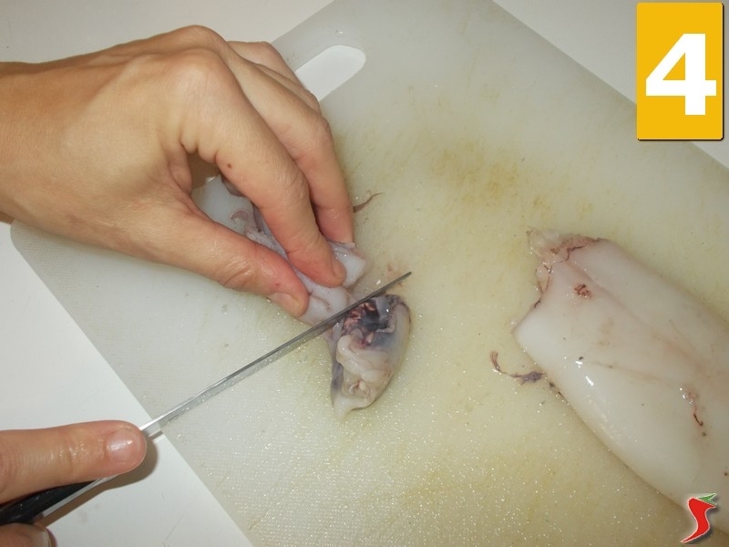 Per fare la ricetta, come prima cosa dovrete pulire la seppia, in quanto questa vine sempre venduta non sviscerata, e con le cartilagini. Infatti è un mollusco invertebrato, senza ossa, le cui uniche parti dure sono il becco e la la lisca trasparente che sorregge la sacca viscerale, la parte più grande della seppia. Quindi dovrete eliminare il becco, gli occhi, la lisca trasparente che lo sorregge e le viscere.Ponete la seppia sul tagliere (1), e con il coltello tagliate la sacca viscerale (2), staccandola dalla parte con i tentacoli e gli occhi. Poi prendete la parte dove sono i tentacoli, per togliere il becco, che riconoscerete per la colorazione nera e la posizione al centro del corpo, da dove si diramano i tentacoli. Fate una leggera pressione ai lati del becco (3), con la punta del coltello, e questo uscirà senza sforzo dalla sua sede (3).