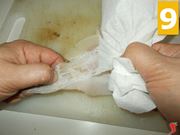 Come detto, la sogliola va anche spellata, tirando via con forza la pelle, che si staccherà dalla carne in modo uniforme. Quindi, dopo aver praticato l'incisione sulla coda, da dove tirerete la pelle, iniziate l'operazione. Ora con le mani, facendo molta forza, sollevate le pelle dal taglio che avete fatto precedentemente con il coltello sulla coda, ed eliminate la pelle della sogliola (7), poi girate il pesce e fate la stesa operazione con il coltello sopra la coda, incidendo in senso verticale (8) e sempre con le mani, eliminate la livrea bianca (9). Successivamente lavate il pesce sotto abbondante acqua corrente per eliminate eventuali residui di sangue, e lasciatelo da parte sopra un piatto piano da portata.