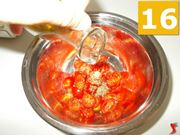 Adesso, nella planetaria, aggiungete due cucchiai abbondanti di olio di oliva extravergine (16) e mescolate accuratamente con un cucchiaio (17) per condire bene i pomodorini. Dopodiché lasciate da parte i pomodorini conditi nello stesso contenitore (18), e proseguite la ricetta.