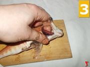 La ricetta va cominciata con la classica pulizia del pesce, che va eviscerato e lavato. Prendete quindi il pesce e mettetelo sul tagliere. Inserite la lama delle forbici nell'orifizio e tagliate (1) fino alla gola dei pesci. Aprite la pancia, e prendete le viscere con le mani (2), per eliminarle. Toglietele e buttatele. Poi fate la stessa cosa con le branchie (3).