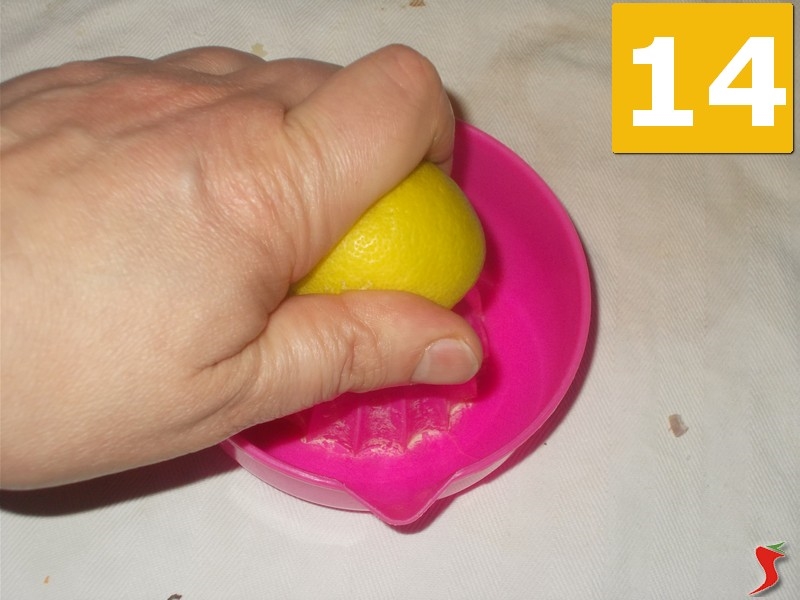 Poi spolverate i pesci con l'origano secco (13). Quindi tagliate in due il limone e spremetene la metà (14) con lo spremiagrumi. Infine versate il succo ricavato, delicatamente, sui pesci (15), facendo attenzione a non disperdere gli odori.