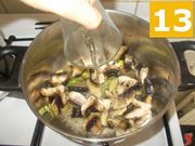 Dopo aver alzato un po la fiamma del vostro fornello, sfumate i funghi in padella con il vino bianco (13) e terminata la reazione chimica, abbassate nuovamente il gas. Mescolate con il mestolo di legno nuovamente (14) in maniera da unire bene tutti gli ingredienti del condimento ai funghi. Coprite con un coperchio e lasciate cuocere per circa venti minuti a fiamma moderata (15). Volta pronto il vostro condimento per la polenta, lasciatelo dentro la casseruola in modo tale che resi ben caldo.