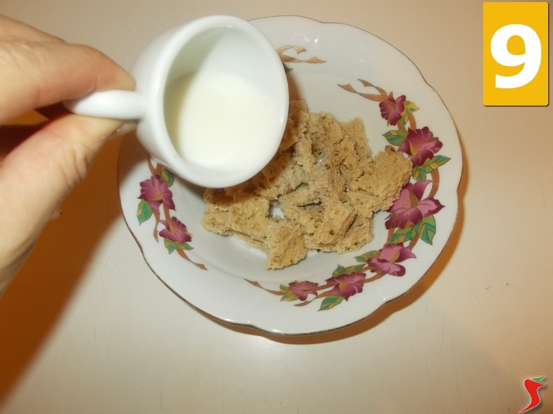 Ora mettete il pane sul tagliere e con il coltello tagliate via la crosta (7) per tenere solo la mollica, che taglierete (8) in tanti piccoli quadrucci da mettere in una ciotolina. Quindi versateci sopra il latte (9) e con la forchetta lavorate il tutto per amalgamarlo e creare una sorta di pappetta.