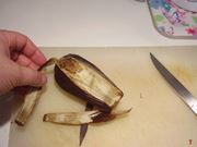 Una volta cotte le melanzane, fatele raffreddare un pochino prima di togliere la pelle semplicemente tirandola. Quindi ponetele in un colino con un peso sopra in modo da far fuoriuscire tutta l'acqua di cottura. Strizzatele un pochino se necessario.