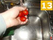 Poi lavate bene i pomodorini (13) sotto l'acqua corrente, e tagliateli in quattro parti (14). Mettete tutto in una scodella e aggiungeteli al tegame (15) insieme agli altri ingredienti.