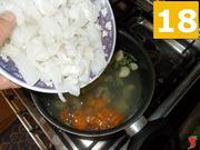 Una volta lavati, poneteli sopra un tagliere e con la punta del coltello eliminate il becco (16) e ripetete la stessa operazione per tutti i calamari che avete a disposizione. Ora tagliateli a fette non troppo sottili (17) ed una volta terminato anche questo passaggio, uniteli nella padella con gli altri ingredienti (18) lasciando cuocere a fiamma bassa.