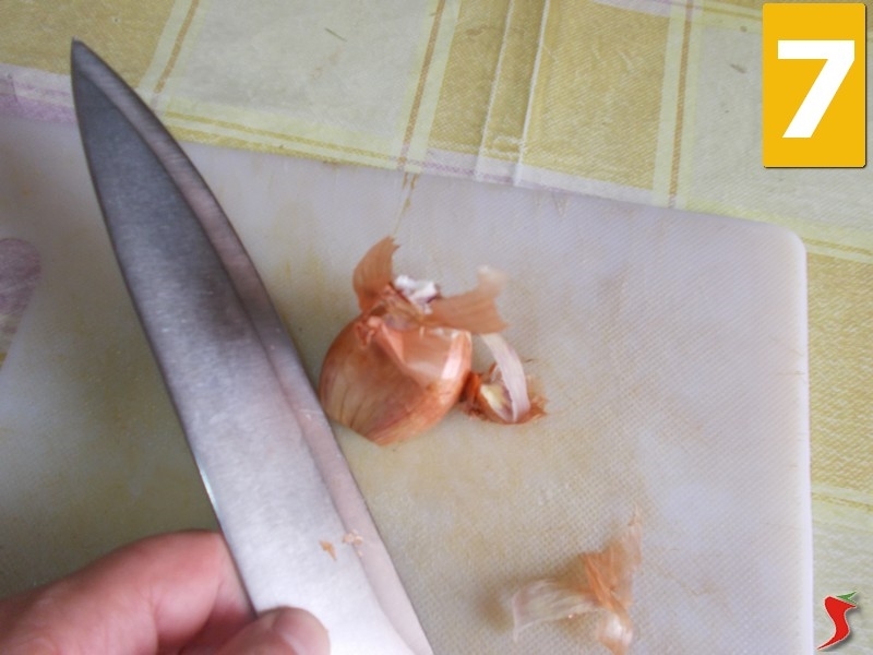 Prendete lo scalogno ed eliminate la buccia (7), dopo con un coltello dalla lama lunga e liscia, iniziate a tagliuzzarlo non troppo finemente (8) ed infine unitelo nel piatto con la carota ed il sedano, lasciandoli da parte (9).