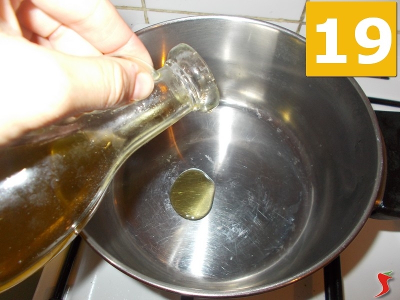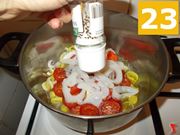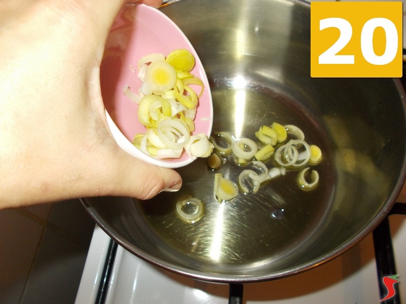 Poi prendete un tegame grande, e versateci dentro cinque cucchiai di olio extravergine di oliva (19) e fateli scaldare a fuoco medio. Una volta caldo, aggiuntevi dentro il porro tritato (20) a soffriggere, e quindi, una volta che il porro diventa trasparente, unite anche i pomodorini pachino (21) per farli appassire dieci minuti con il coperchio.