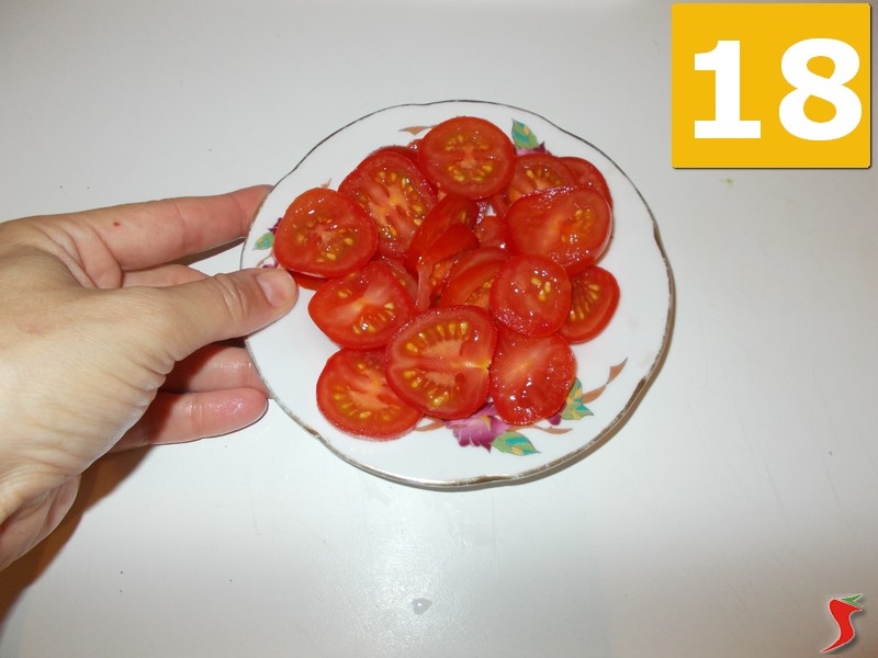 Ora è la volta dei pomodorini pachino. Lavateli bene (16) sotto l'acqua corrente, asciugateli e quindi metteteli sul tagliere. Qui, con il coltello a lama seghettata, per non rovinare l'affilatura con l'acidità del pomodoro, iniziate a tagliarli a rondelle (17) più fini possibili, e poi metteteli da parte in ciotolina (18), cercando di conservare il liquido vegetale.
