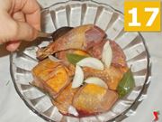 Ora non vi resta che aggiungere anche gli spicchi di cipolla (16) e dare un'altra mescolata (17). Riponete l'insalatiera con la faraona nel frigorifero (18) e fate marinare per circa tre ore, prima di riprenderla.