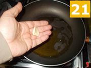 Terminata la marinatura, iniziate a fare il soffritto per cuocere la faraona. Versate cinque cucchiai di olio extravergine di oliva (19) in una padella grande e fateli scaldare. Nel frattempo sbucciate lo spicchio d'aglio (20) e poi mettetelo a dorare nell'olio (21).