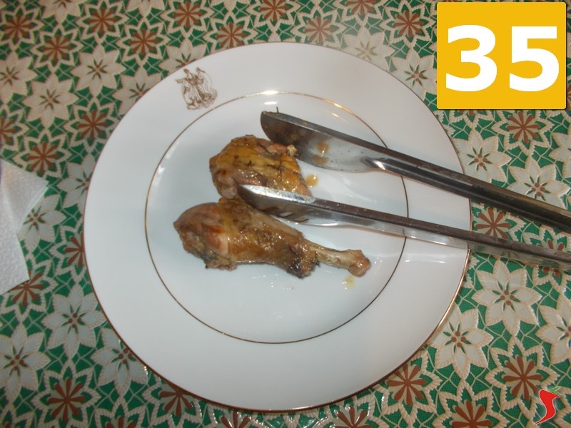 Nel frattempo filtrate la marinatura (31) in un colino, e lasciatela a parte in un bicchiere (32) per poi versarla sulla faraona (33) senza le erbe.