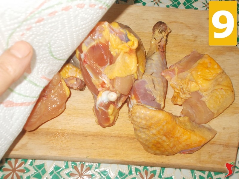 Ora prendete la faraona e passatela sui fornelli accesi (7) per bruciare tutti i residui di piume. Quindi lavatela bene (8) sotto l'acqua corrente, e fatela scolare. Poggiatela sul tagliere e tamponate bene con della carta assorbente (9) per asciugarla.
