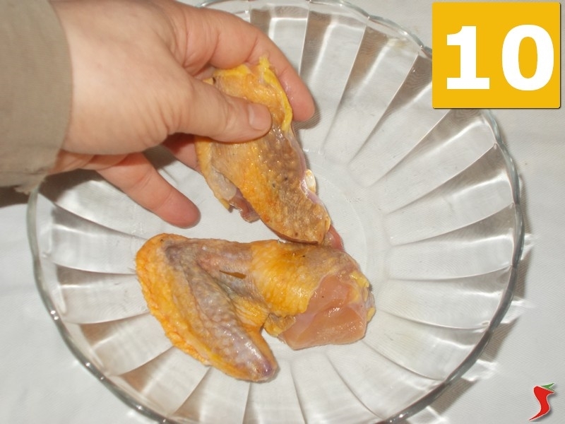 Quindi mettete i pezzi di faraona ben asciutti in un'insalatiera (10) e versateci sopra il succo di limone (11) e il vino rosso (12).