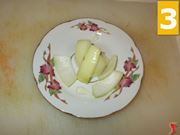 Iniziate la ricetta prendendo la cipolla per metterla sul tagliere (1) e sbucciarla. Quindi tagliatela a pezzi grandi (2) e mettetela su un piattino (3) a parte.