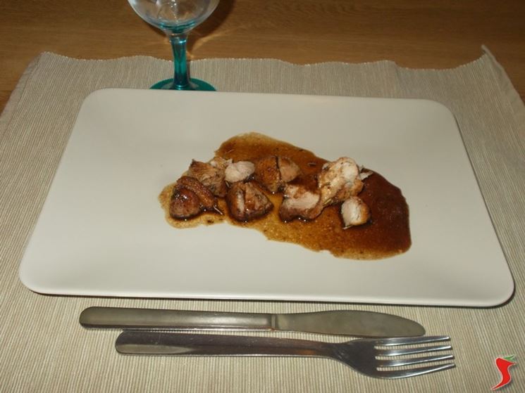 Quando la padella è ben calda, versate la salsa all'aceto balsamico (22) nella padella, e fatela ridurre e insaporire con il petto (23) per circa 5 minuti. Quindi spegnete il fuoco e adagiate il petto sul tagliere (24). Riprendete all'aceto balsamico la salsa e versatela in una tazza.